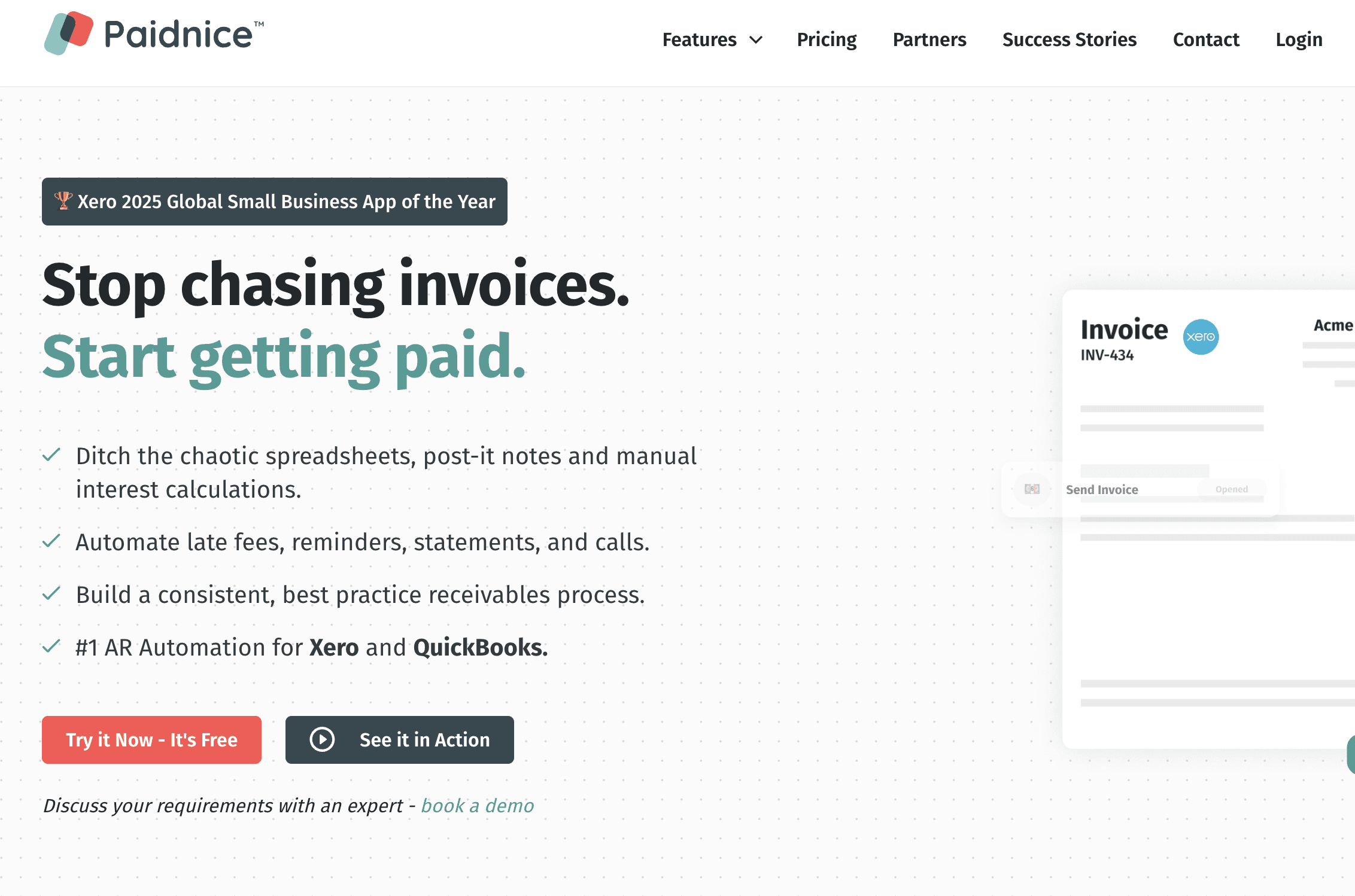 Paidnice takes a distinctly different angle to InvoiceSherpa. While Sherpa focuses on general reminders, Paidnice is built specifically to enforce late payment penalties. It automatically applies late fees and interest charges to overdue invoices in Xero and QuickBooks. If your main frustration with InvoiceSherpa is that it doesn't adequately penalize late payers, Paidnice is the tool you want. Just keep in mind that automatically slapping interest charges on clients can damage relationships if you're a creative agency or consultant.