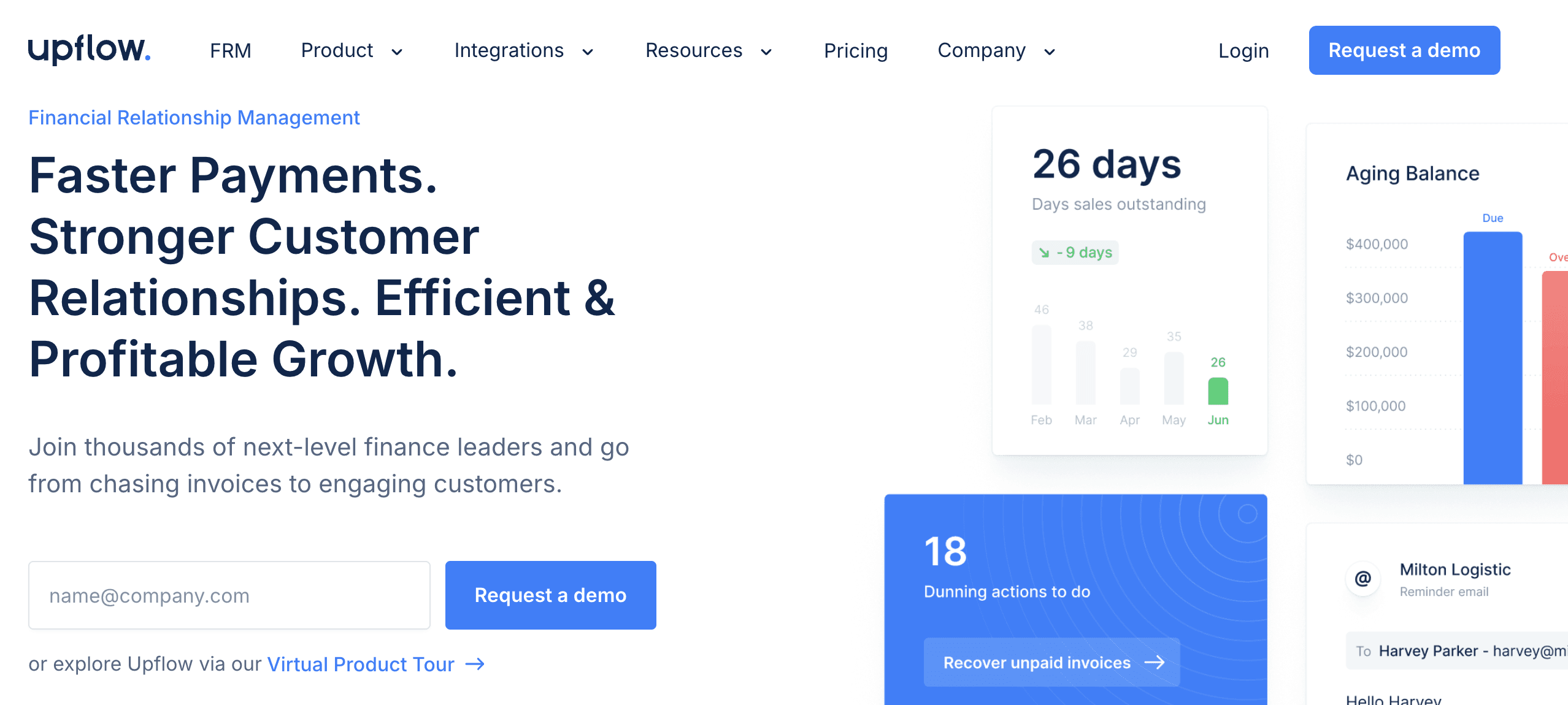 Upflow is a sleek, modern AR platform that makes InvoiceSherpa look like it was built a decade ago. It focuses heavily on B2B payment collection and provides incredibly detailed financial analytics and cash flow visibility. If your finance team needs robust internal workflows and collaborative tools to manage AR, Upflow delivers. The catch is that they hide their pricing behind a "book a demo" wall, which typically indicates an enterprise price point far higher than InvoiceSherpa's base tier.